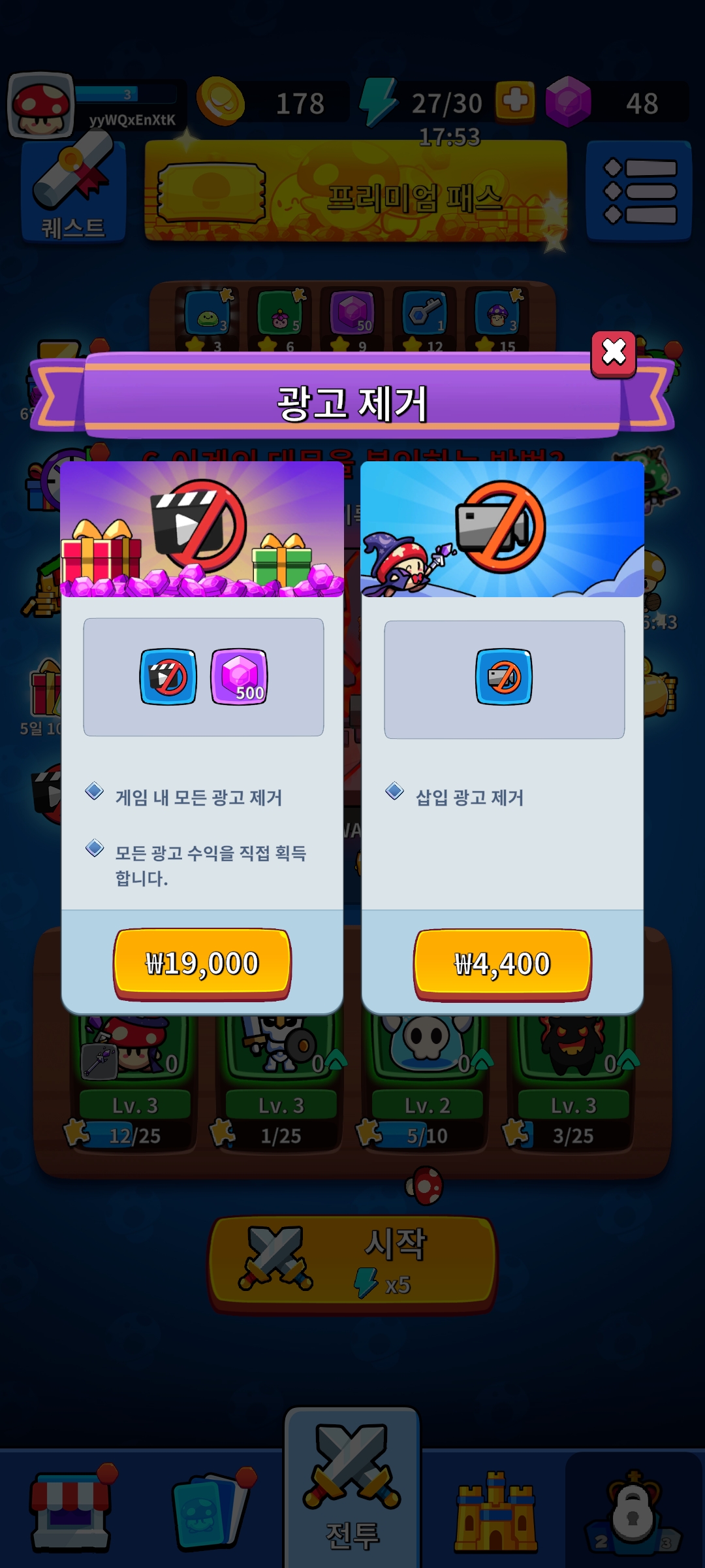 광고제거가 2종류가 있다. 이 게임을 소소하게라도 즐기려면 4400원 짜리 광고제거는 사야된다. 솔직히 1만9천원 짜리는 살필요는 없를 것 같다. 광고로 주는 보상이 많지도 않다.